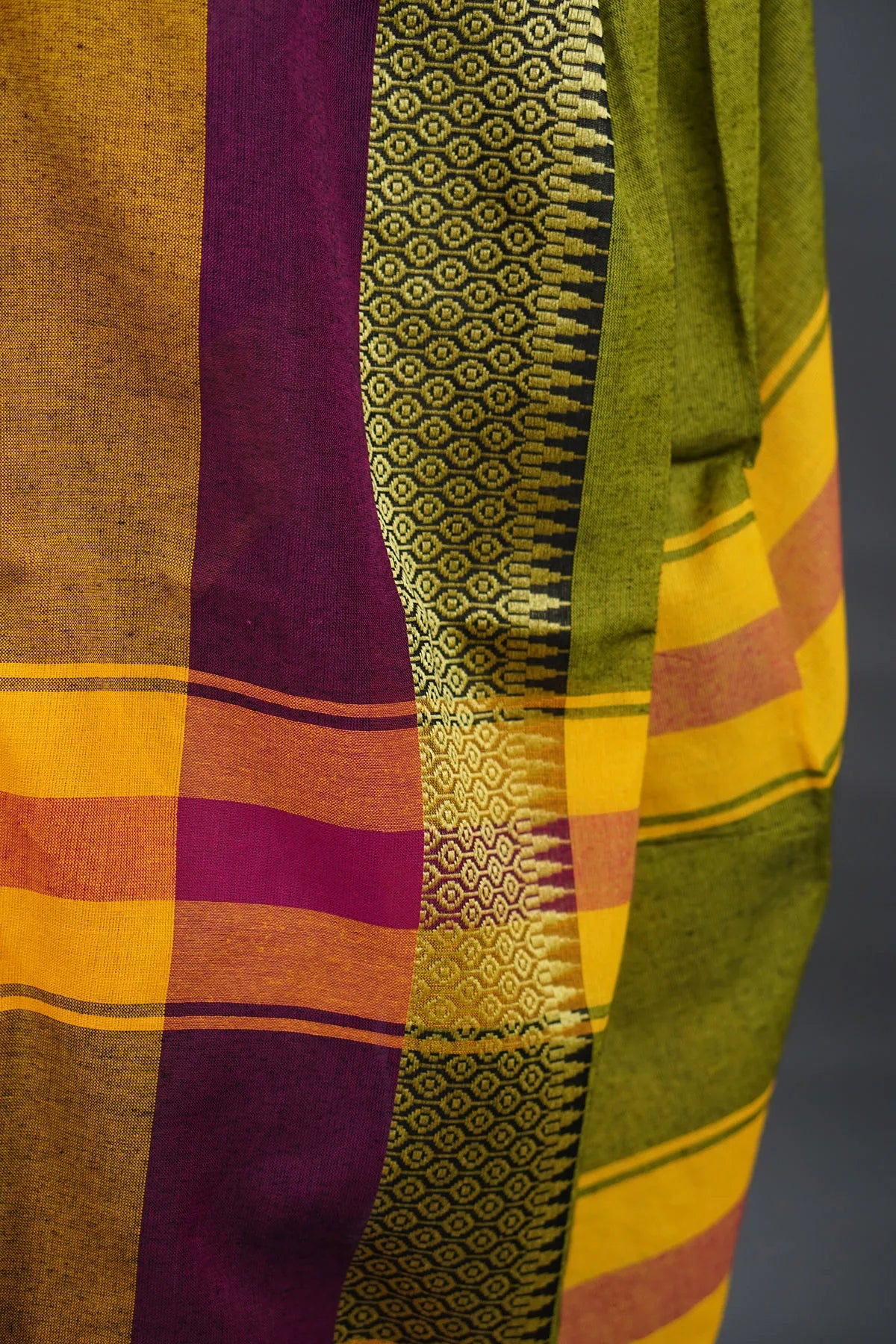 Upgrade your ethnic wardrobe with this stunning handloom cotton saree, a perfect blend of tradition and contemporary style. This saree features an intricate mix of colors and patterns, making it a versatile choice for various occasions.