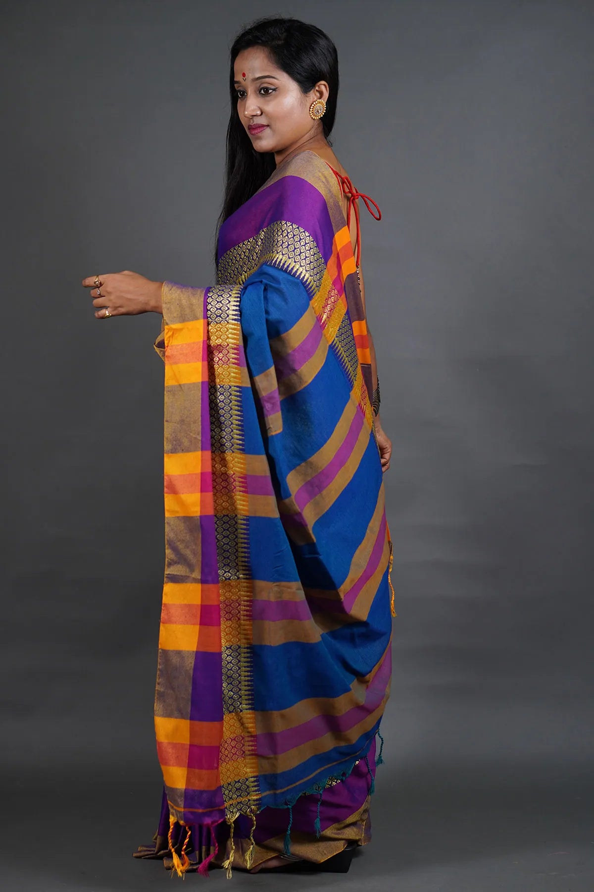 - Pallu: Richly designed with multicolor stripes and geometric patterns