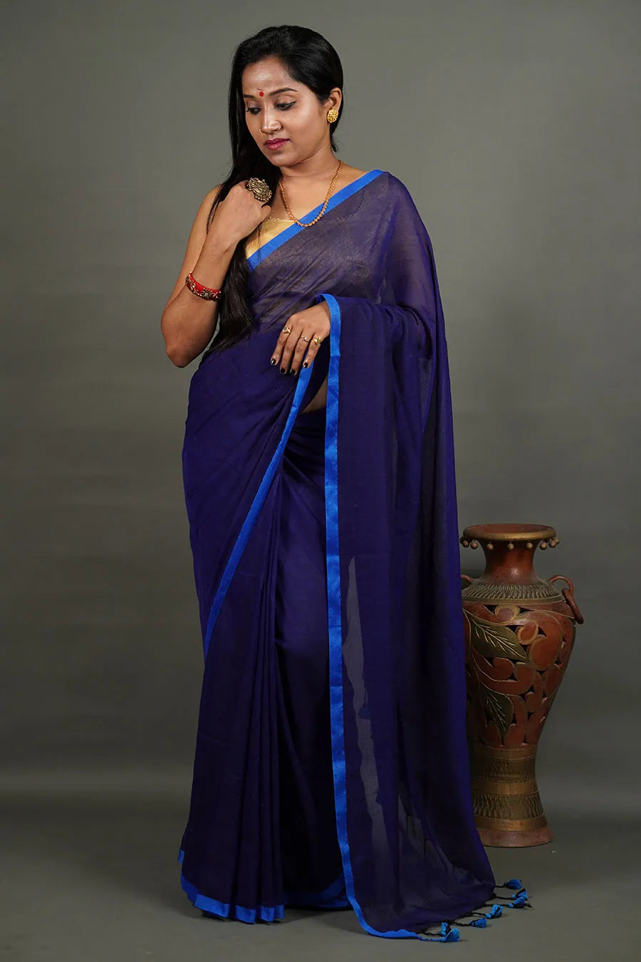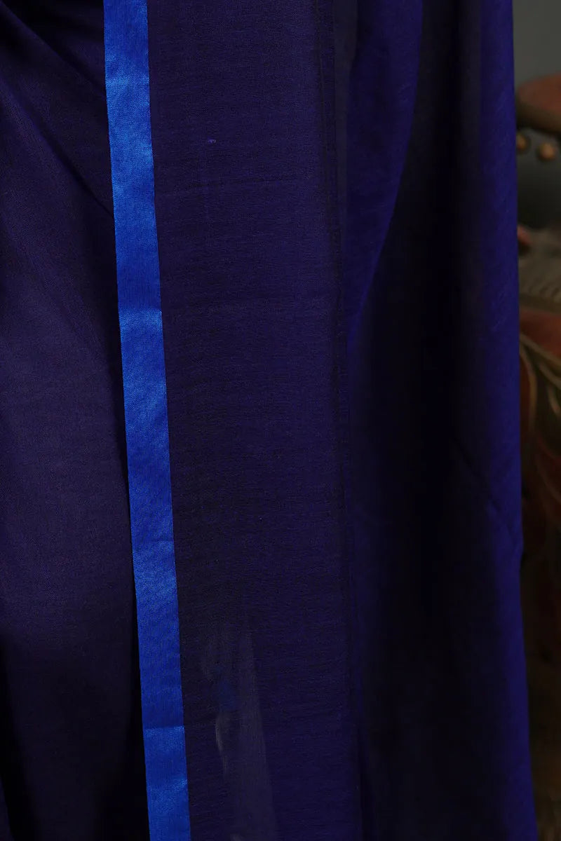 Dark Indigo Mul Mul Cotton Saree with Blue Border
