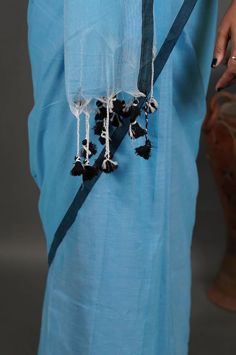 Sky Blue Mul Mul Cotton Saree with Dark Blue Border