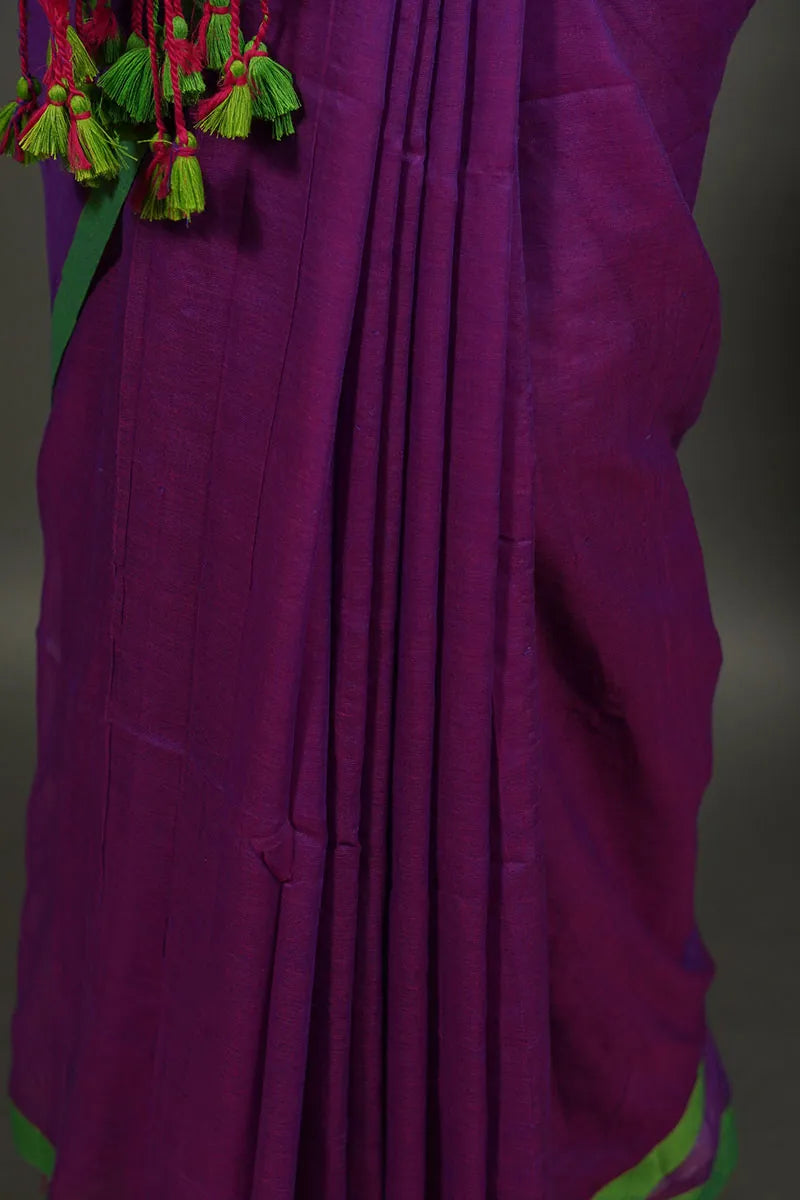 Warm Purple Mul Mul Cotton Saree with Green Border